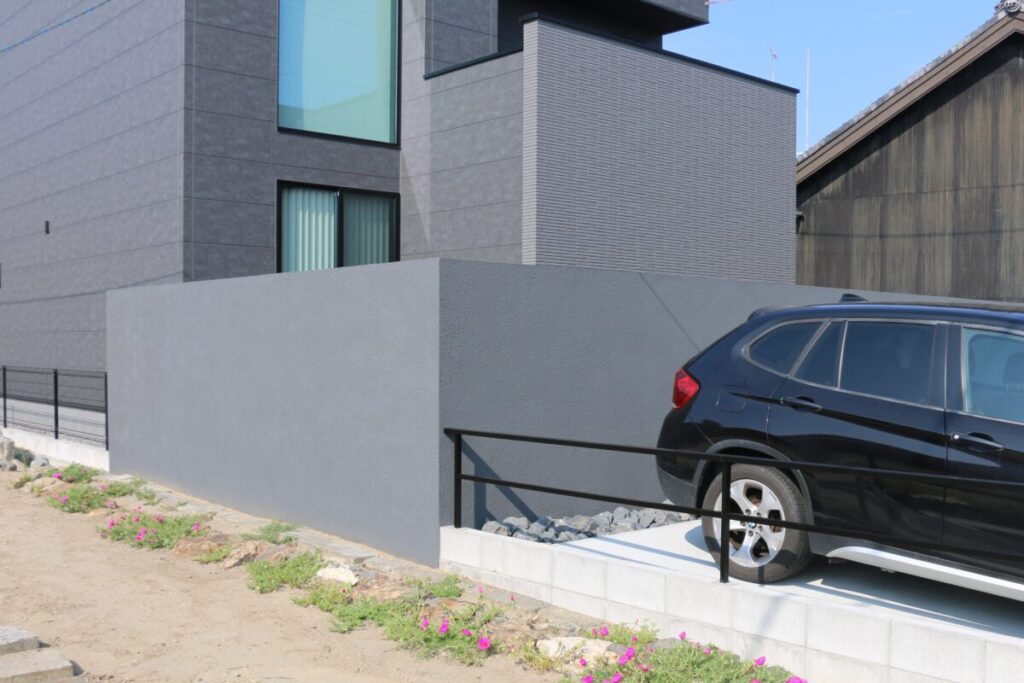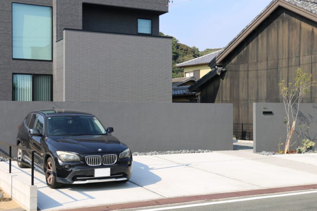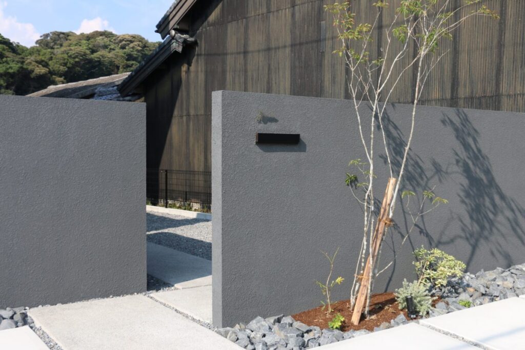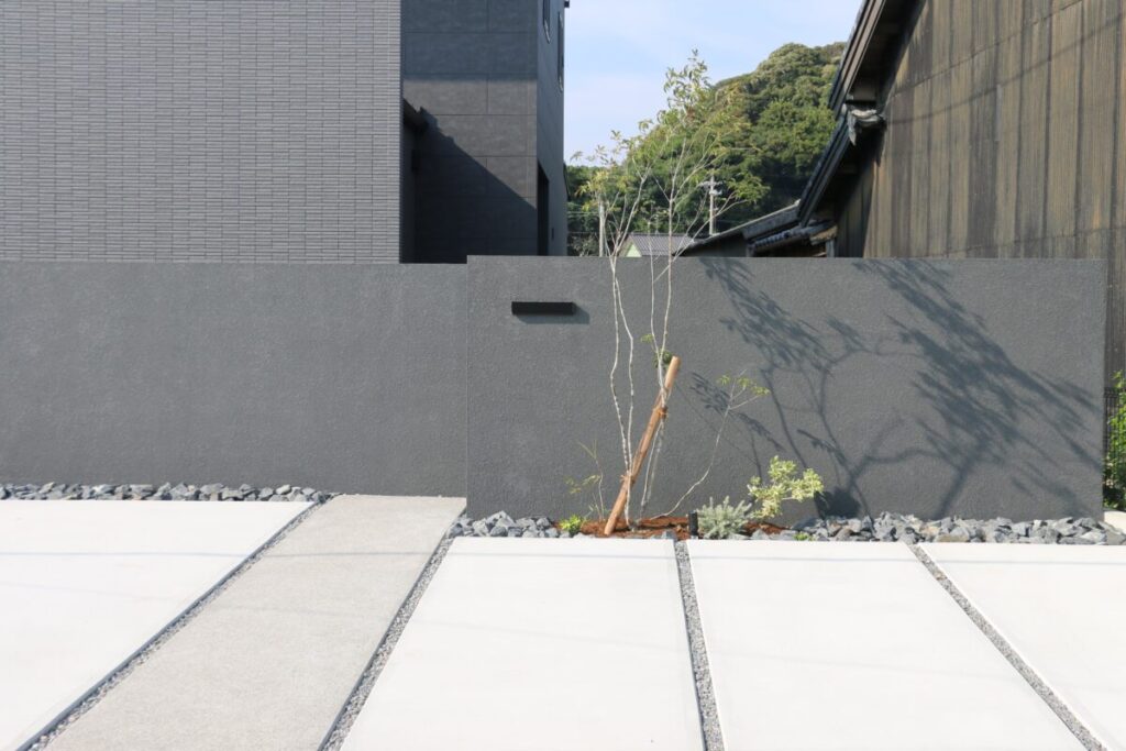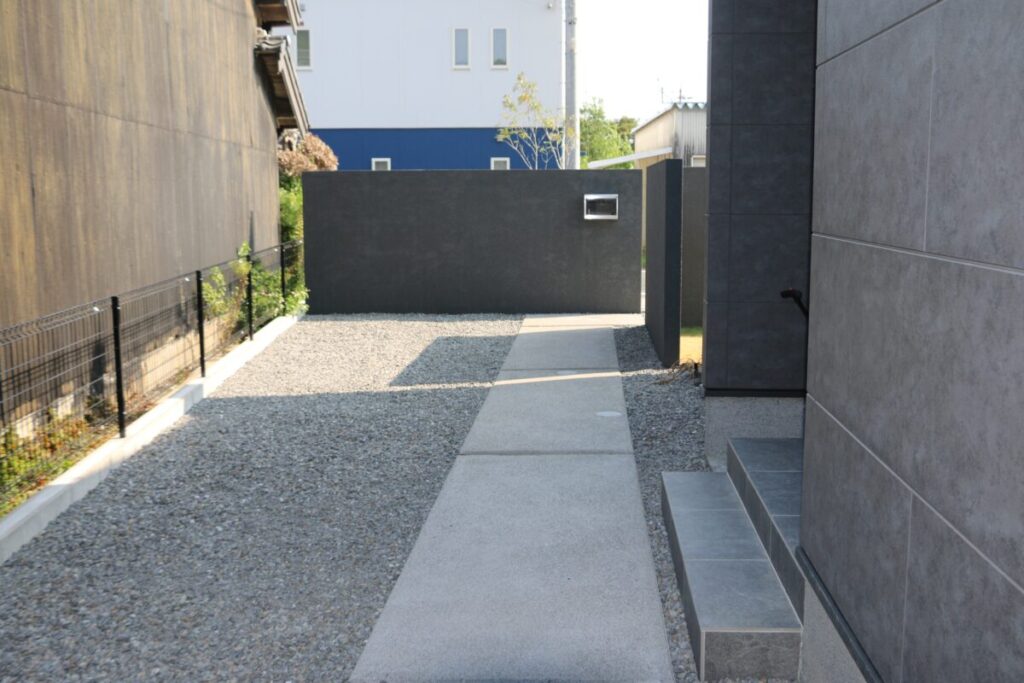 段違いの門柱の中央から玄関へ向かうアプローチを通れる配置にしました。グレー系で統一してシックに仕上げています。裏の敷地には天然芝を敷き詰めました。