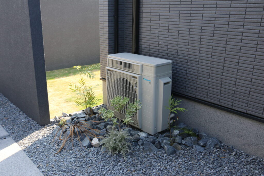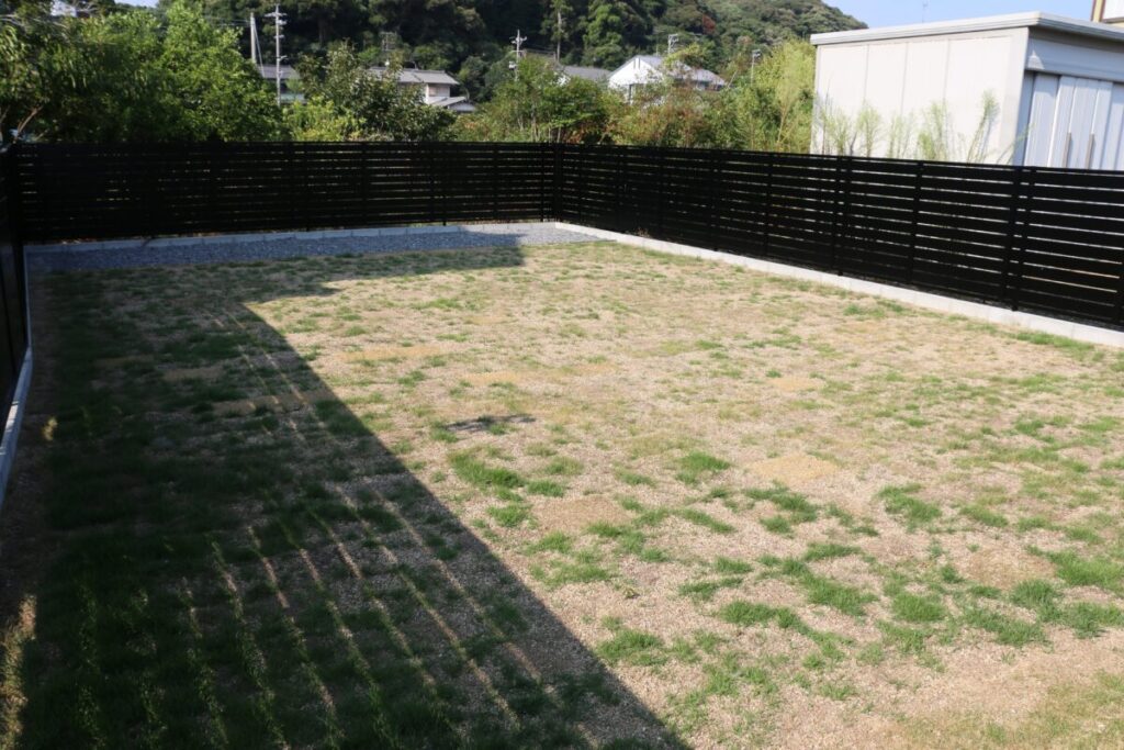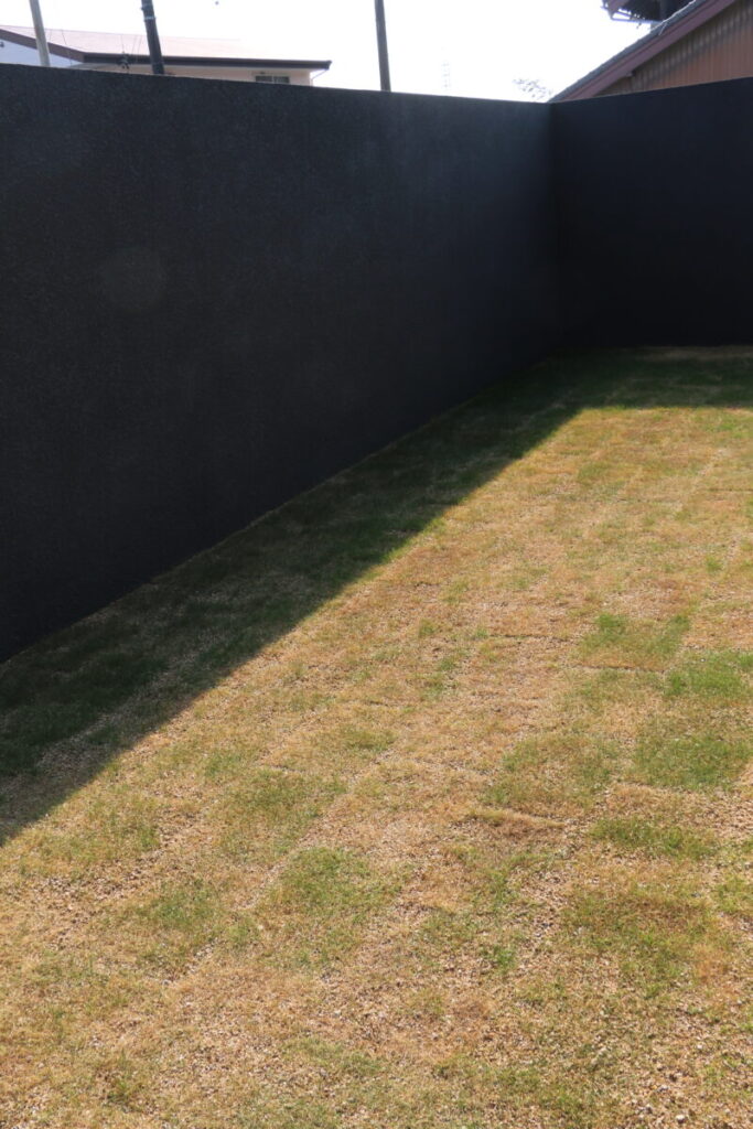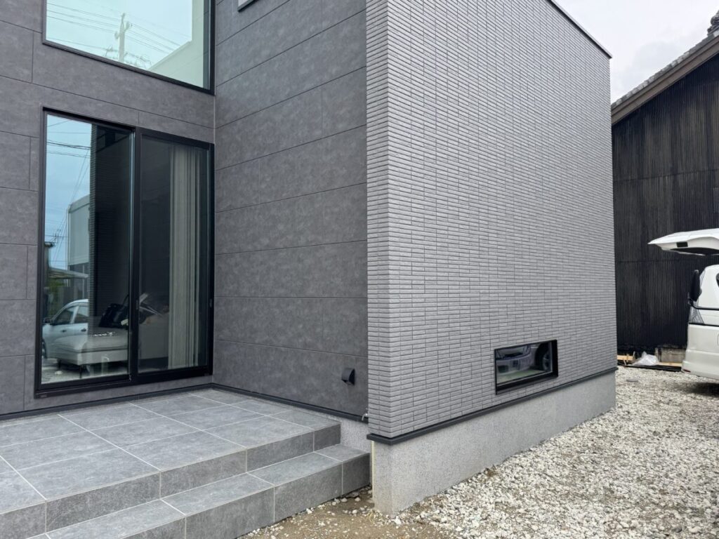 段違いの門柱の中央から玄関へ向かうアプローチを通れる配置にしました。グレー系で統一してシックに仕上げています。裏の敷地には天然芝を敷き詰めました。