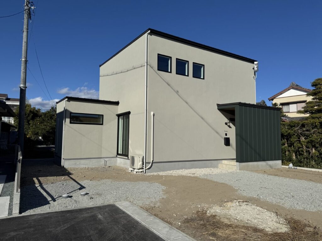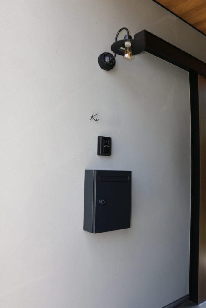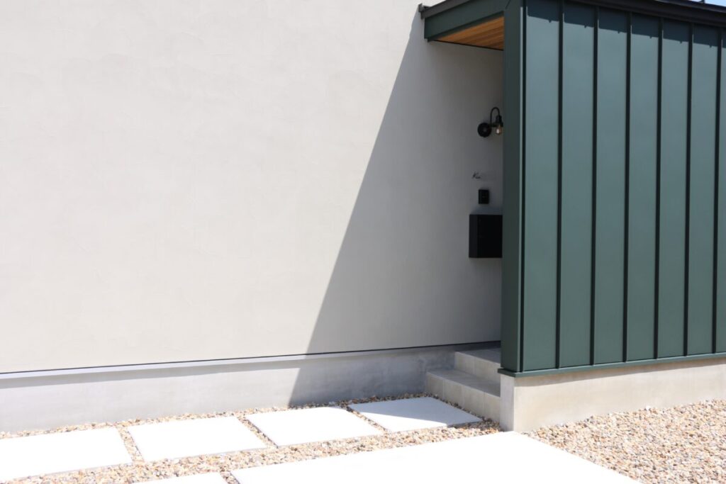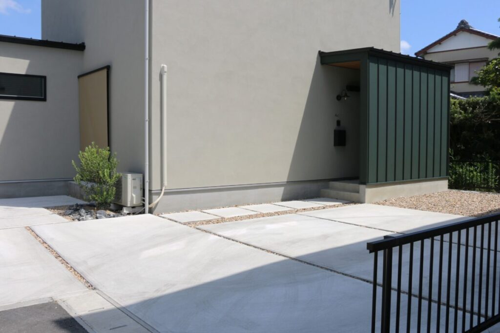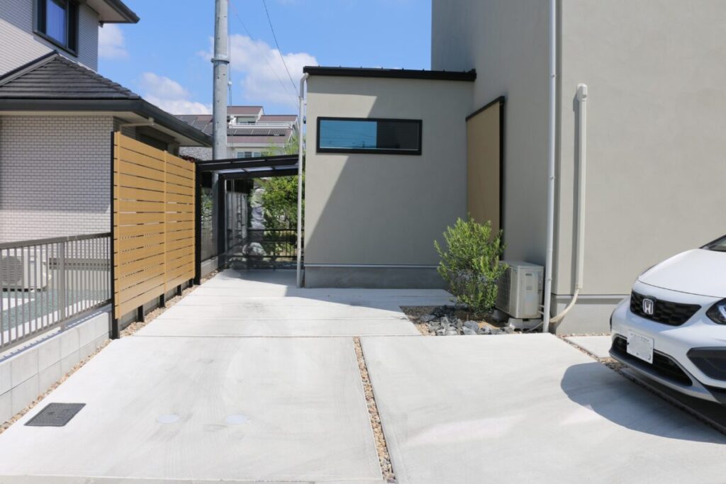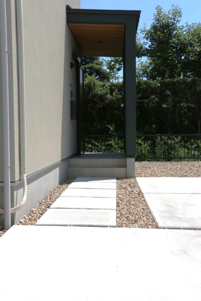 土間コンクリートの駐車スペースが広々とありチャート石を組み合わせることで全体的にナチュラルで柔らかいお庭になりました。門柱をあえて作らず、表札・ポスト・インターフォンは壁付けでおしゃれに仕上がっています。