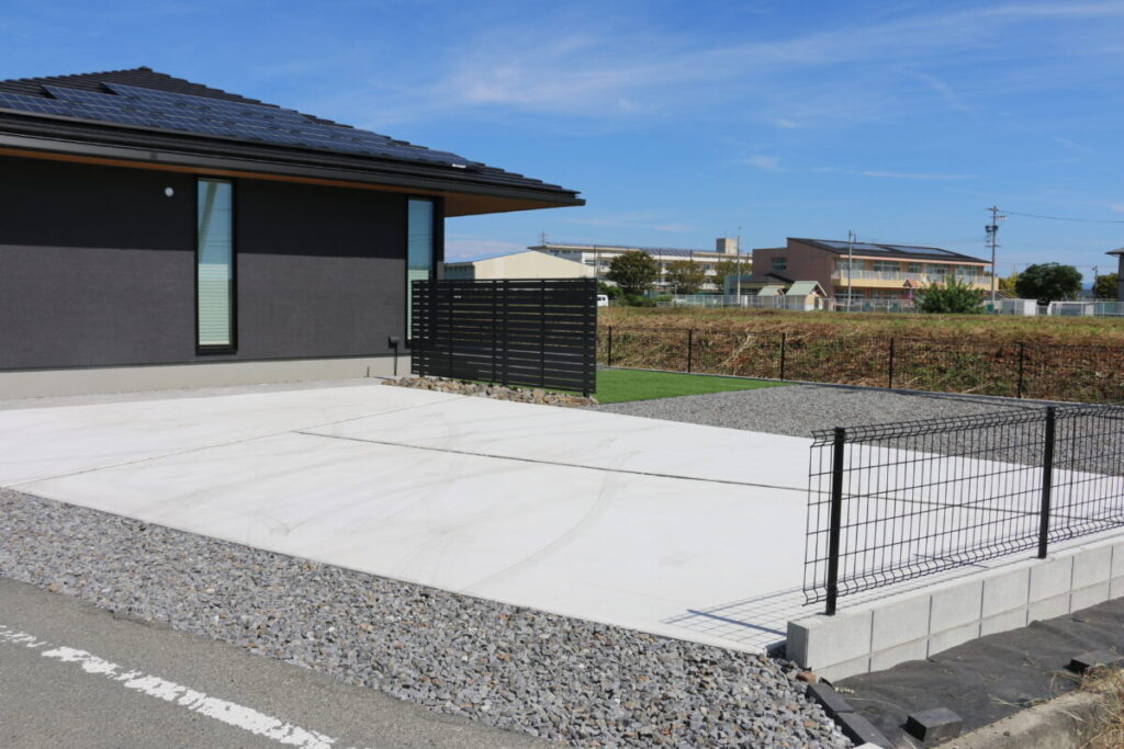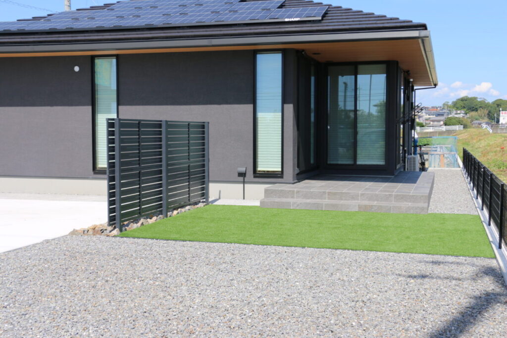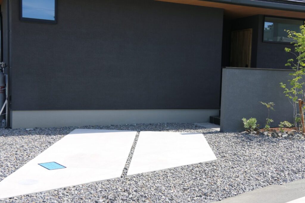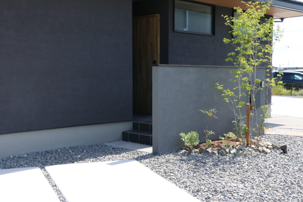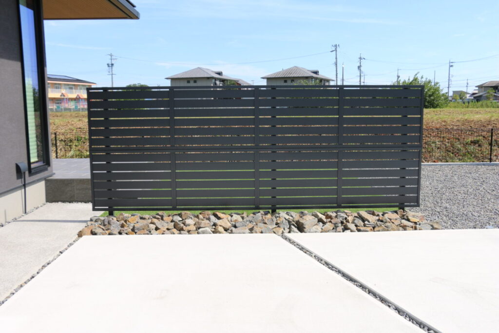 広々した敷地に充分な駐車スペースを確保し土間コンクリートの殺伐さを変形目地切を用い和らげています。シックになりすぎないように目隠しフェンスをダスクグレーにし、茶色石の配置で立体感を出し全体的に自然素材を生かしたスタイリッシュな外構になりました。