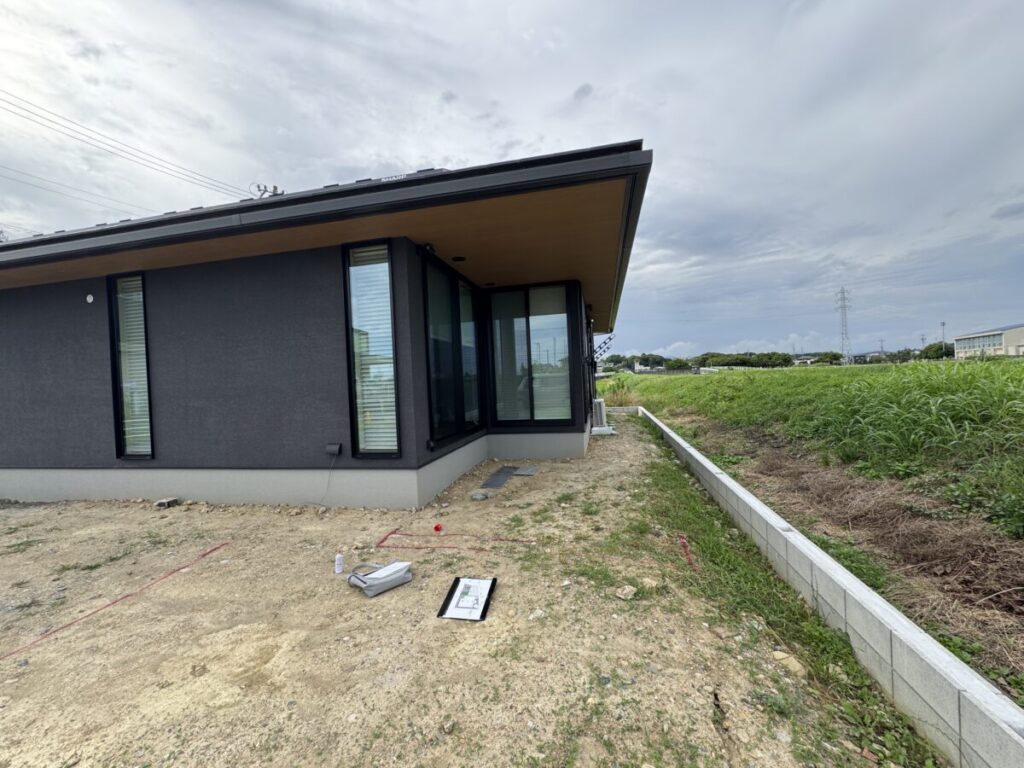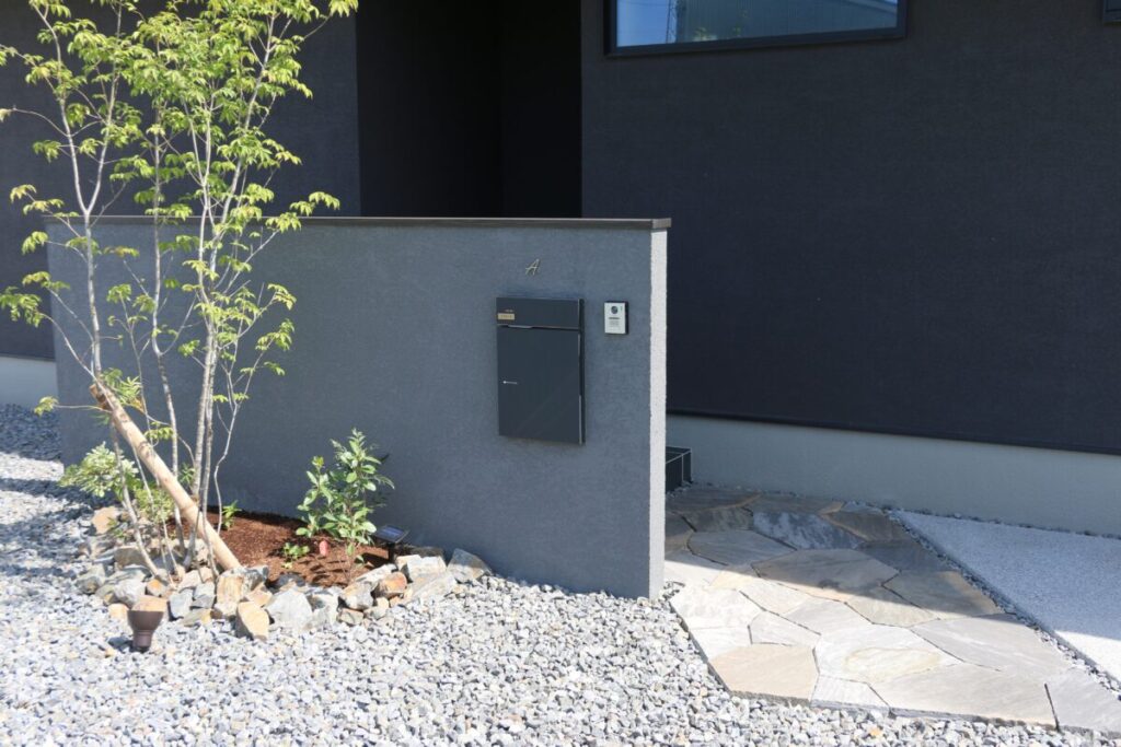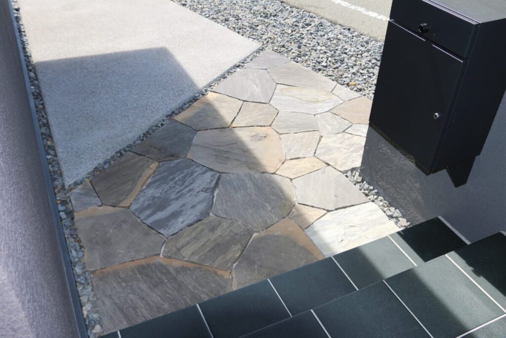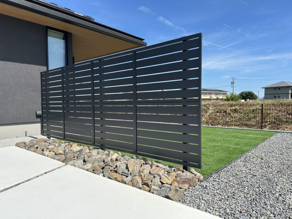 広々した敷地に充分な駐車スペースを確保し土間コンクリートの殺伐さを変形目地切を用い和らげています。シックになりすぎないように目隠しフェンスをダスクグレーにし、茶色石の配置で立体感を出し全体的に自然素材を生かしたスタイリッシュな外構になりました。