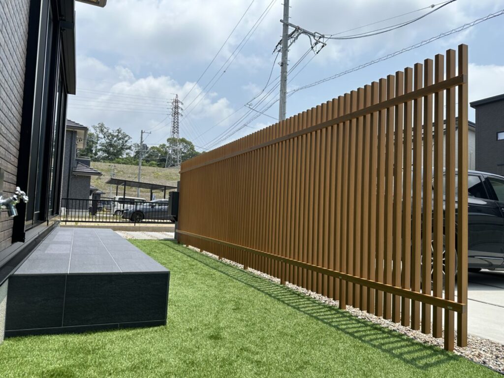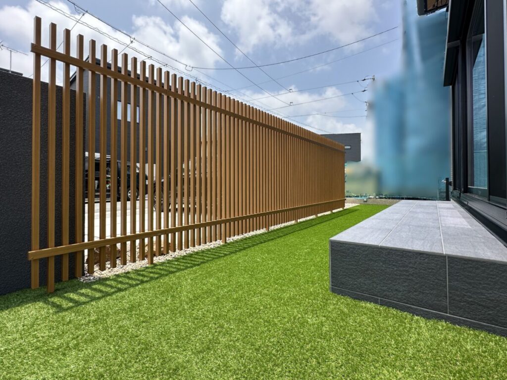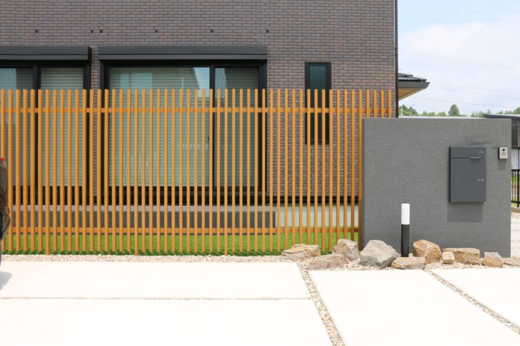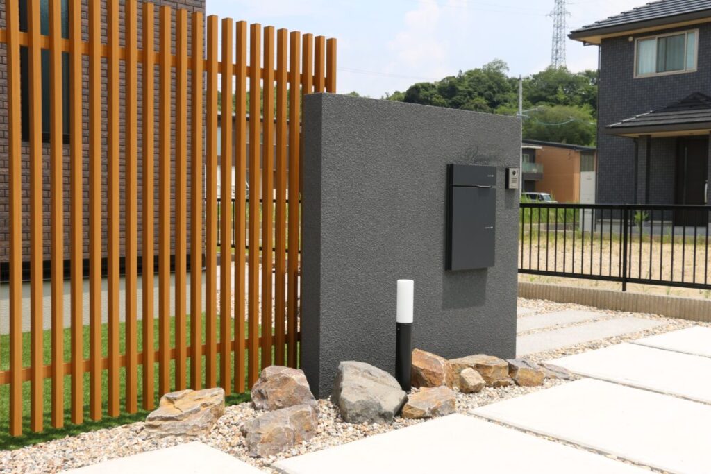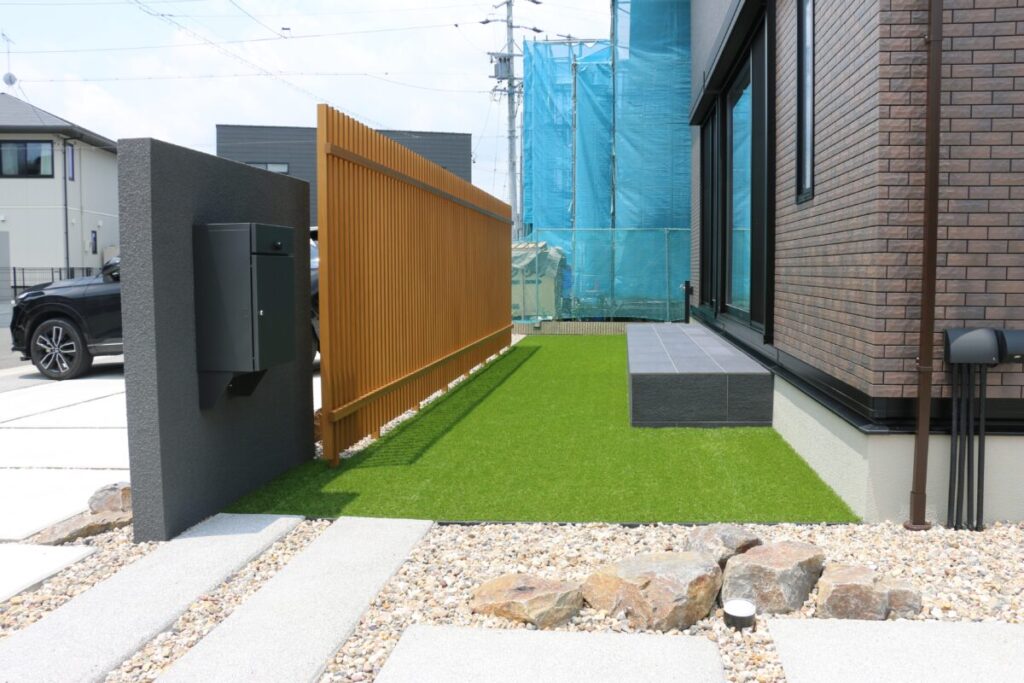 虫が苦手だったり、水やりなどの手間が煩わしかったりとそれぞれの理由で植栽はいらないお客様も多いです。そのようなお客様の要望を形に出来たらいいなとデザインしました。植栽がなくともゴロ石で風情を出し木調のフェンスの配置で和を表現しました。