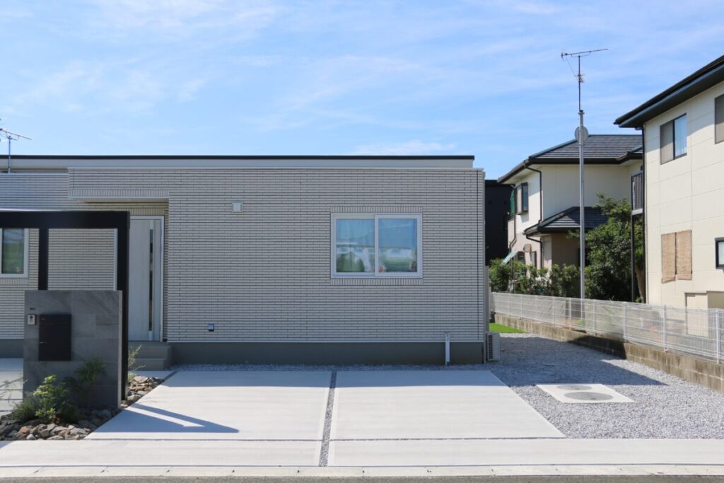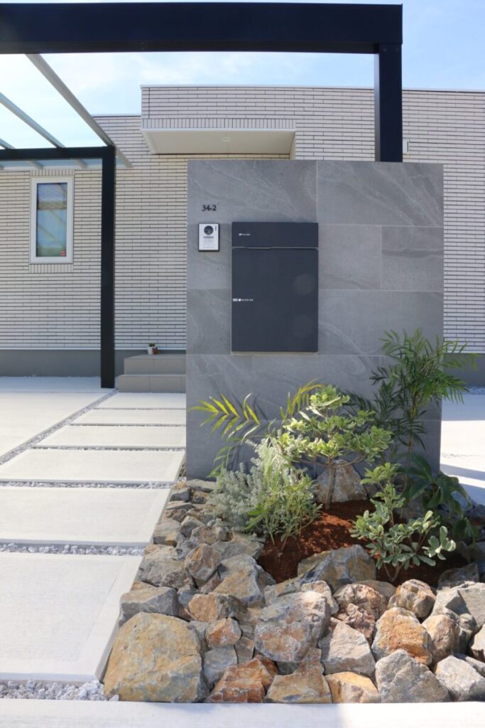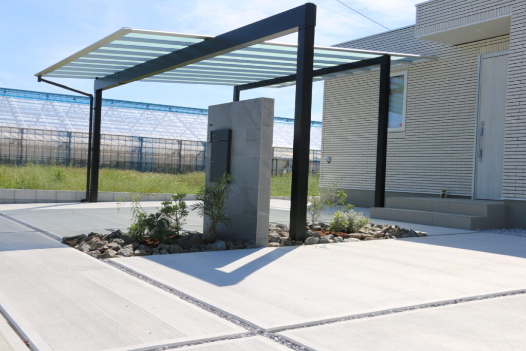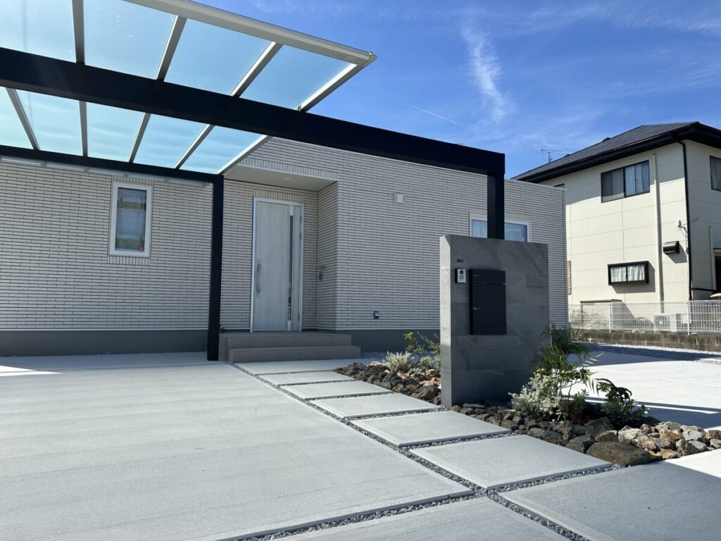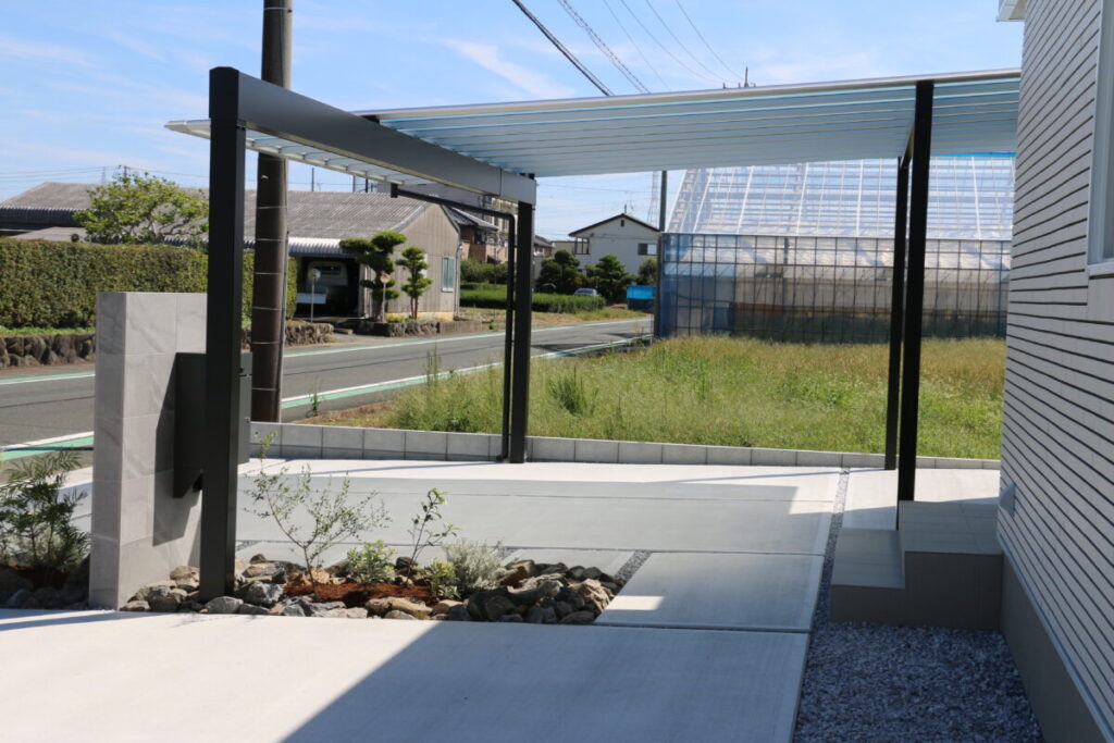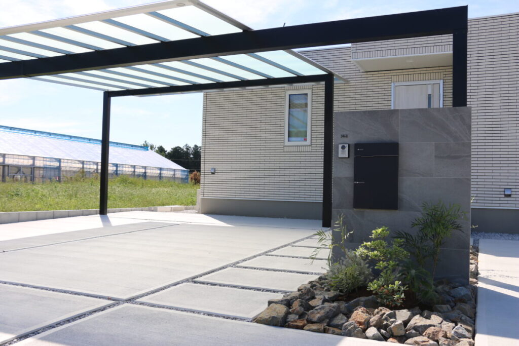 シンプルながらも上質な素材選びと丁寧な施工で、住まいの品格を引き立てます。ブラックフレームのカーポートは、直線美と機能性を兼ね備え、雨の日も快適な動線を確保。コンクリート敷きのアプローチには砂利目地を施すことで排水性とデザイン性を両立。植栽や石材を配したロックガーデンが四季の移ろいを感じさせる癒しの空間を演出します。