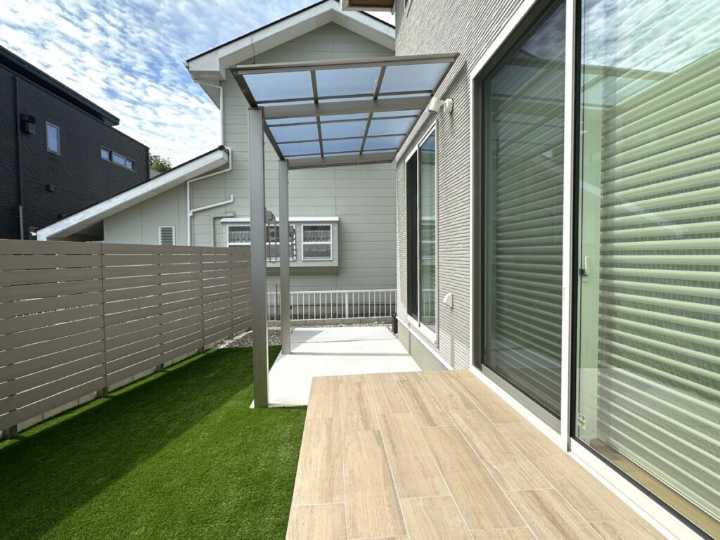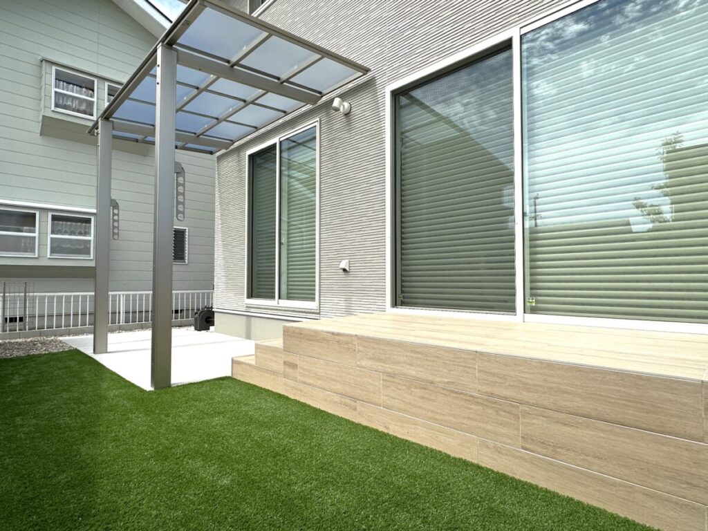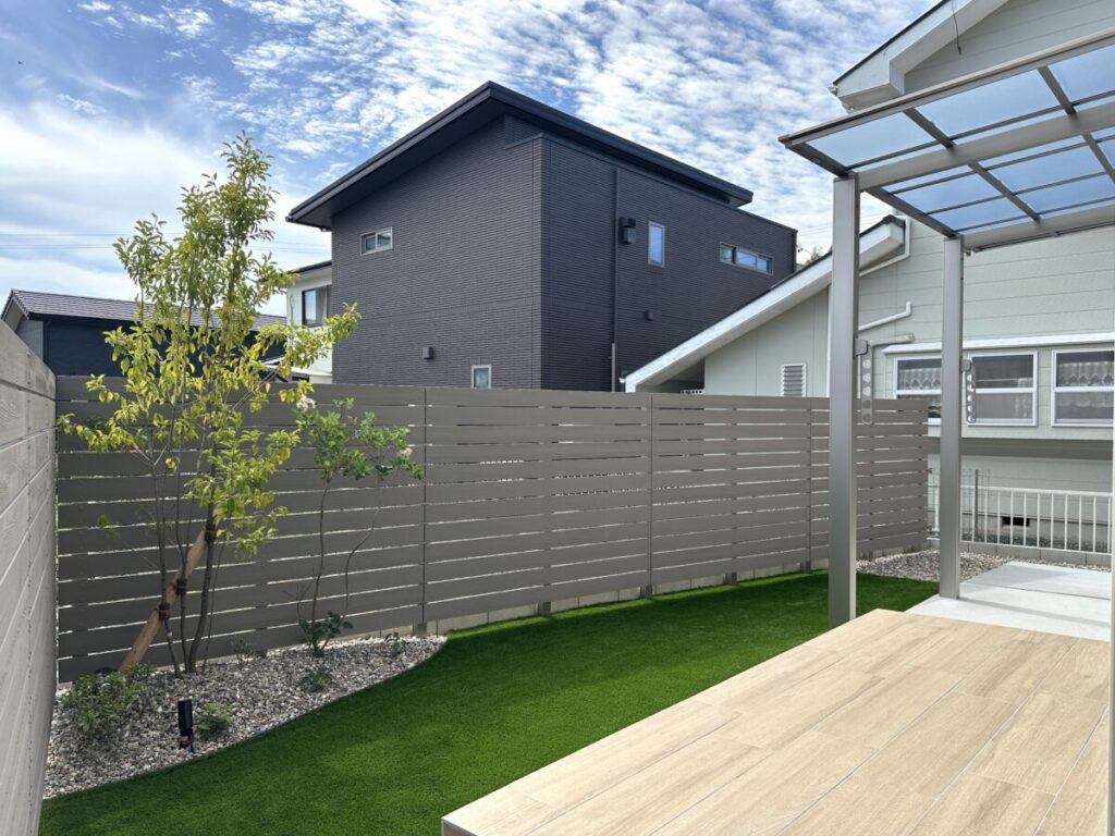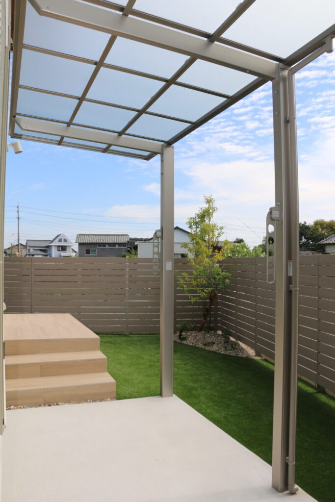 お庭や玄関周りは目隠しフェンスはエコモックフェンス(色:グレージュ)で覆い、お庭のデッキ横に屋根付きテラスがあります。天候を気にせず洗濯物を干せ、ふとした瞬間、お庭の植物から季節を感じ楽しむことが出来ます。デッキはタイル貼りで木調プリメーロを使用しました。砕石は幼いころ集めた小石のような矢作砂利です。独立機能門柱はヴィゴ門柱タイプ宅配ボックス付きです。