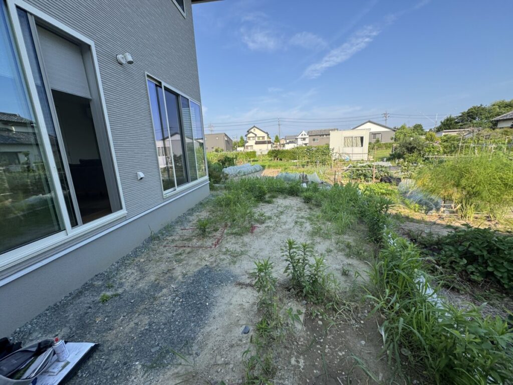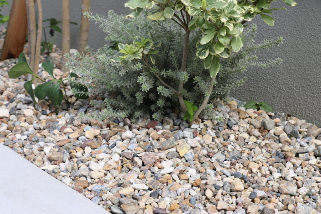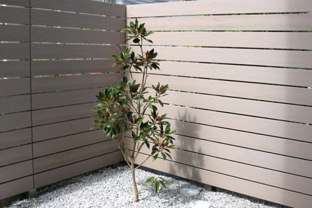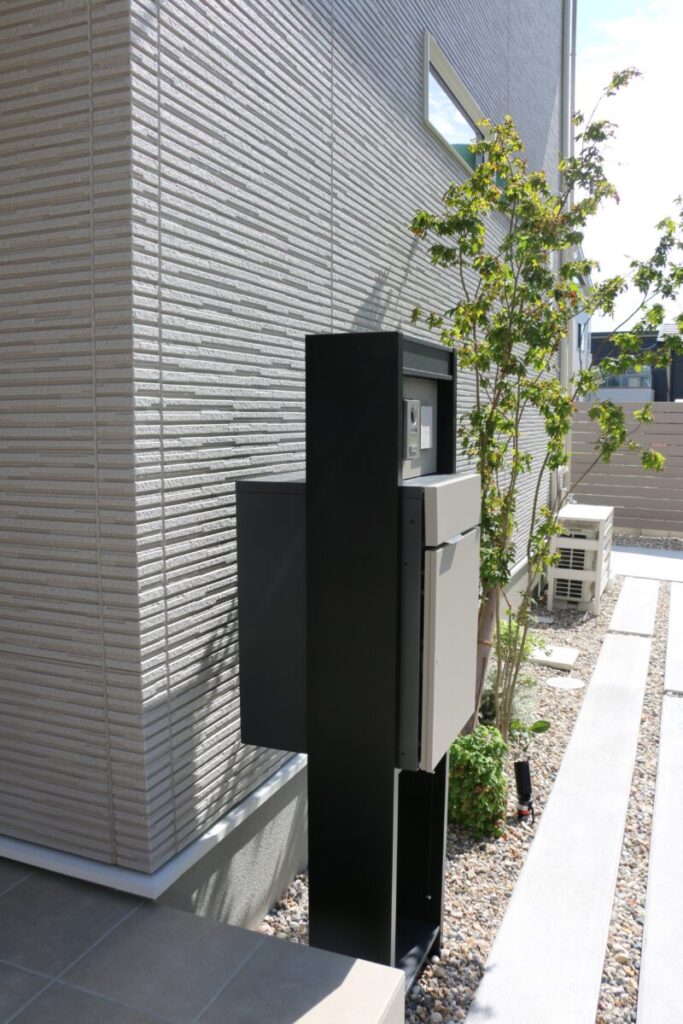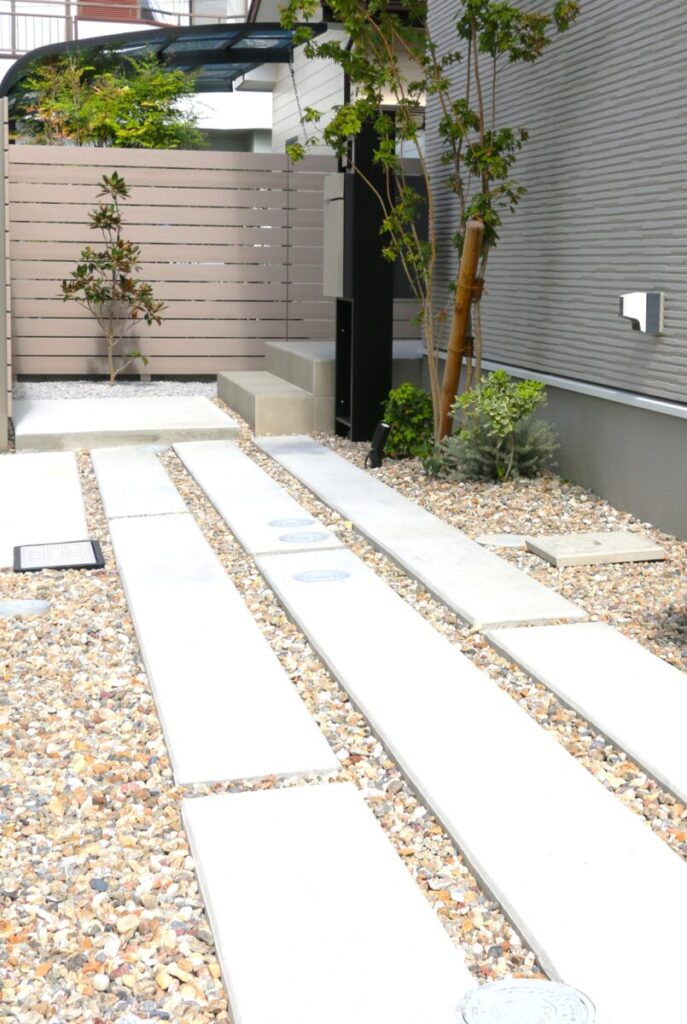 お庭や玄関周りは目隠しフェンスはエコモックフェンス(色:グレージュ)で覆い、お庭のデッキ横に屋根付きテラスがあります。天候を気にせず洗濯物を干せ、ふとした瞬間、お庭の植物から季節を感じ楽しむことが出来ます。デッキはタイル貼りで木調プリメーロを使用しました。砕石は幼いころ集めた小石のような矢作砂利です。独立機能門柱はヴィゴ門柱タイプ宅配ボックス付きです。