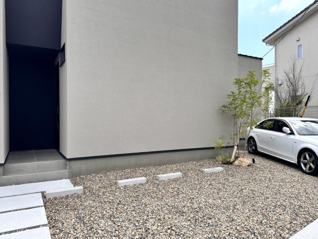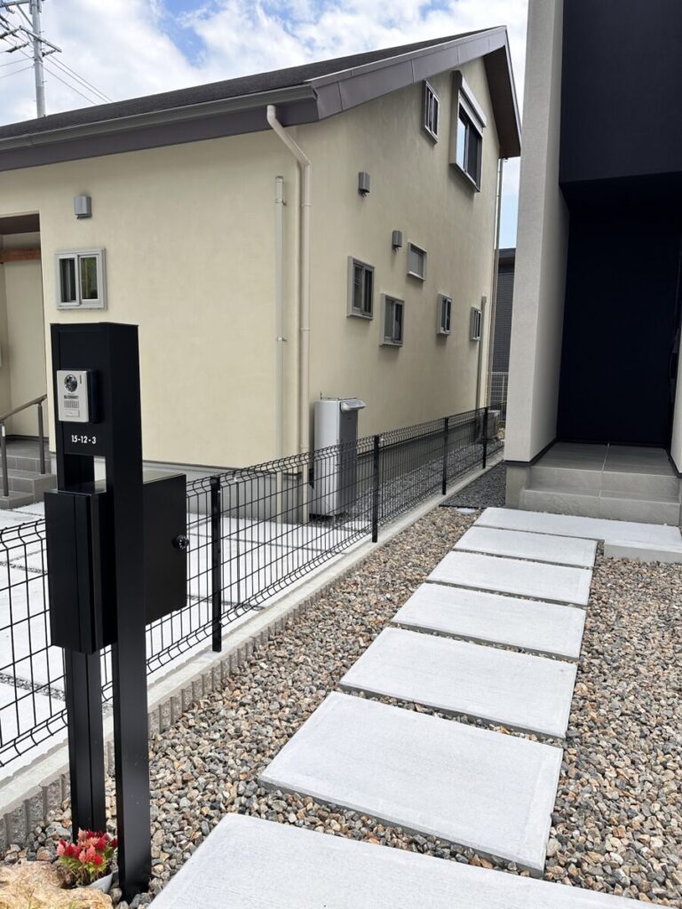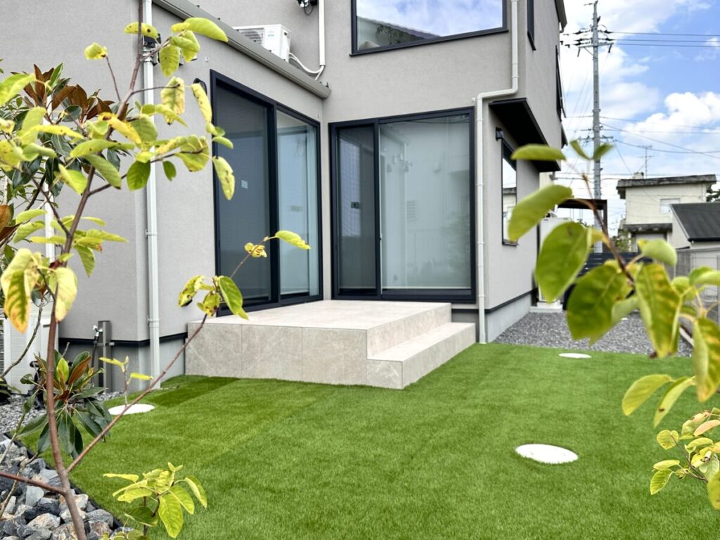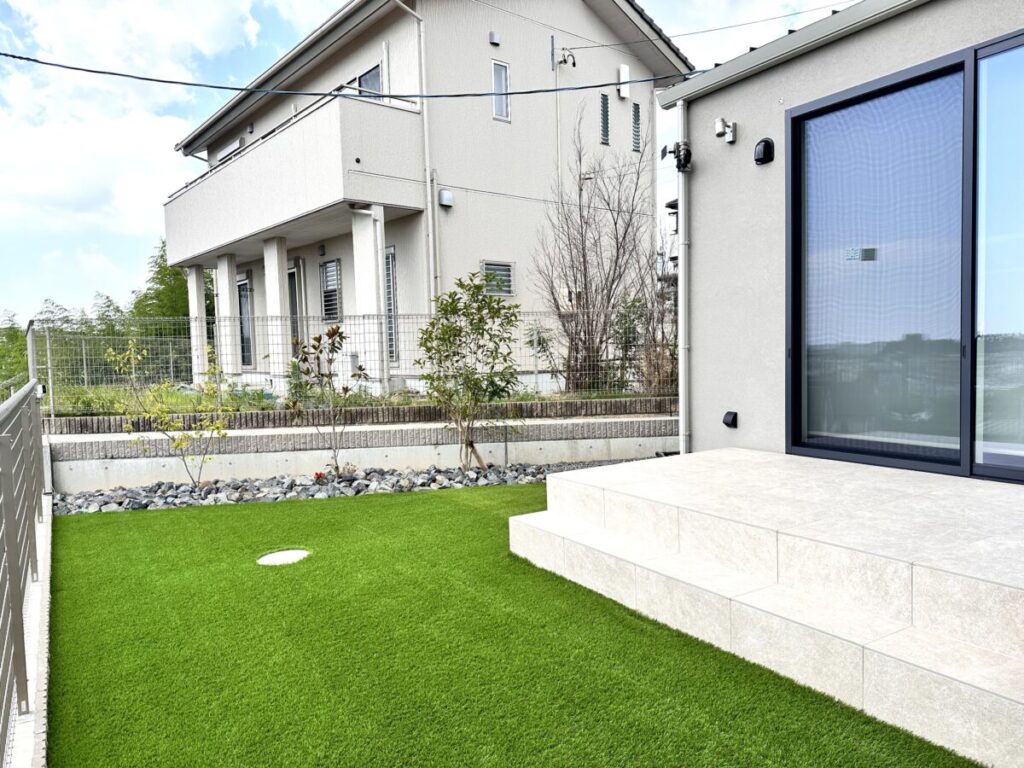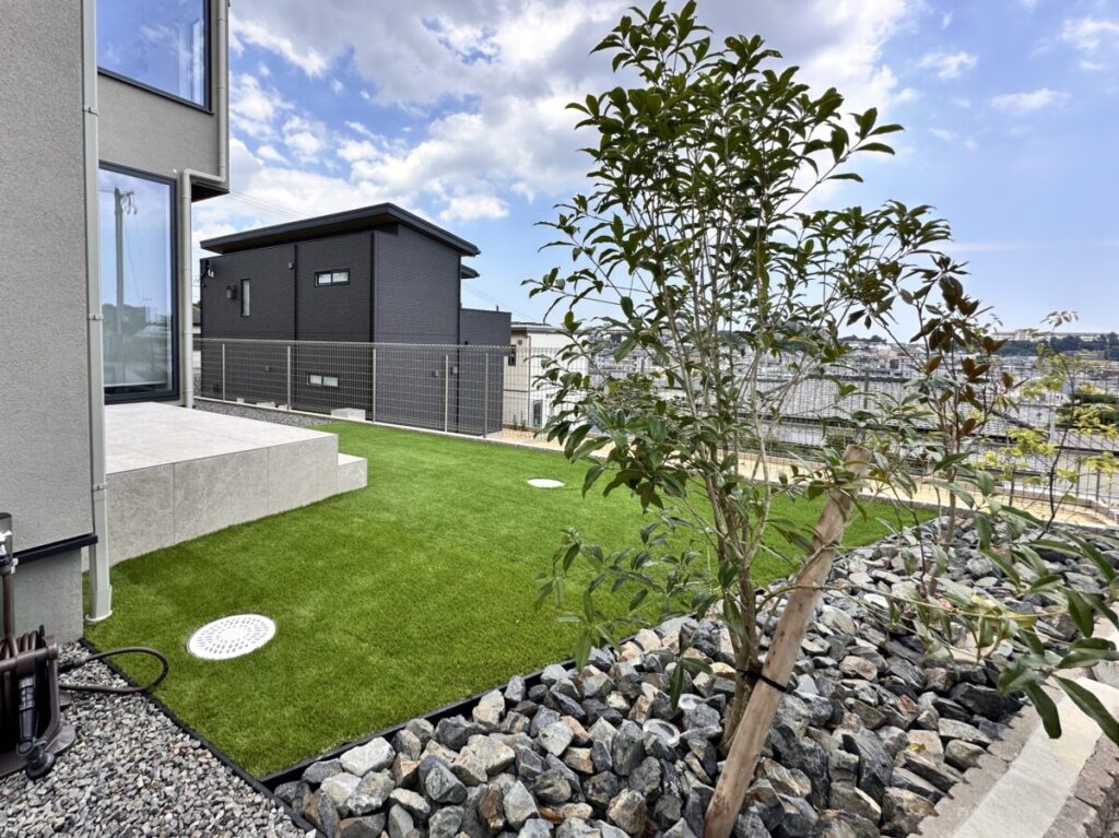機能門柱はアクシー2型で番地を入れ、玄関アプローチは土間コンクリートで動線を確保しました。優しい感じを砕石の茶色や楕円の葉のオリーブで表現しています。お庭側は人工芝と砂岩・植栽で緑豊かなデザイン性も出しています。リビングからフラットなタイルデッキは使いやすくお家の色と同色系で一体感を出しました。高台の立地がお庭に広がりをもたらしとても開放的なプライベート空間が出来ました。
