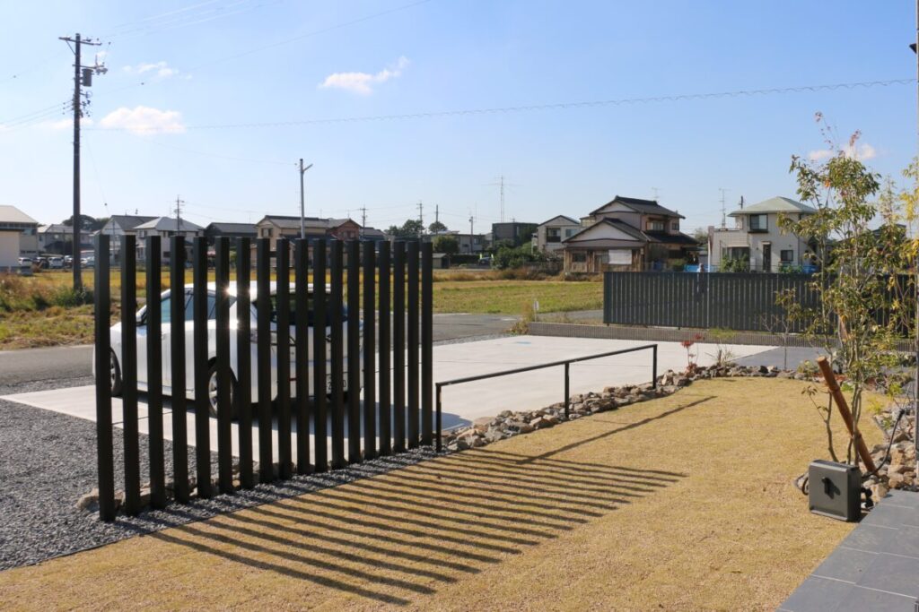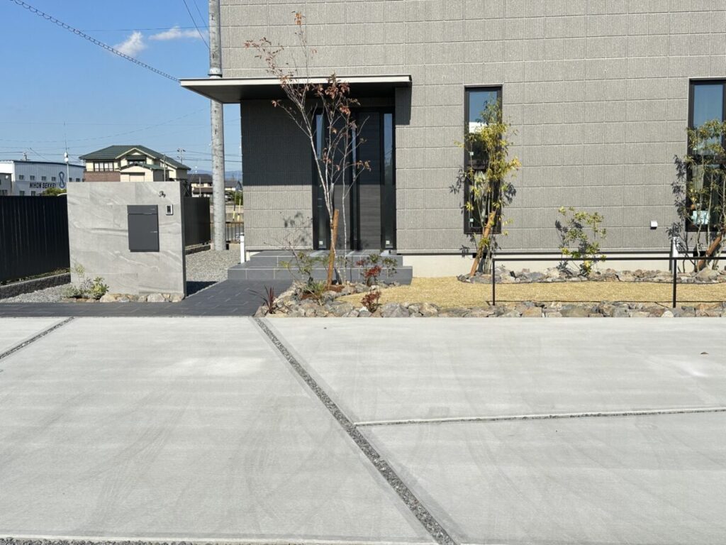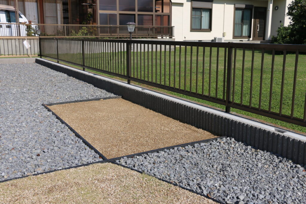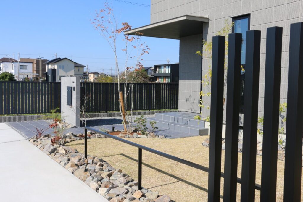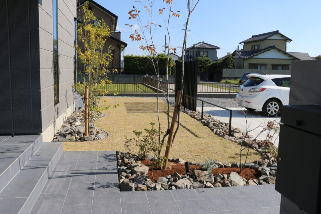 重くなりすぎない玄関横のフェンスはLIXIL/フェンスABTS2型(縦貼り)こちら新色のダスクグレーです。存在感のある門柱も明るいグレーで縦横1.5M×1.5Mでありながら重くなりすぎない印象です。駐車場と天然芝の仕切りが角柱と手摺りゴロ石で作り曲線でエッチングされた植栽部は全体的に開放的なデザインでとても気持ちいいです。ゴロ石も一部通りやすくややフラットに石を配置してあります。春に生い茂る芝や新緑の木々を見るのが楽しみなお庭に仕上がりました。