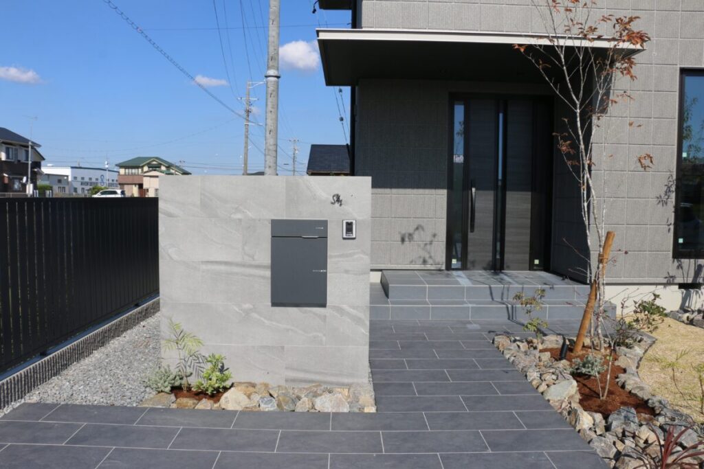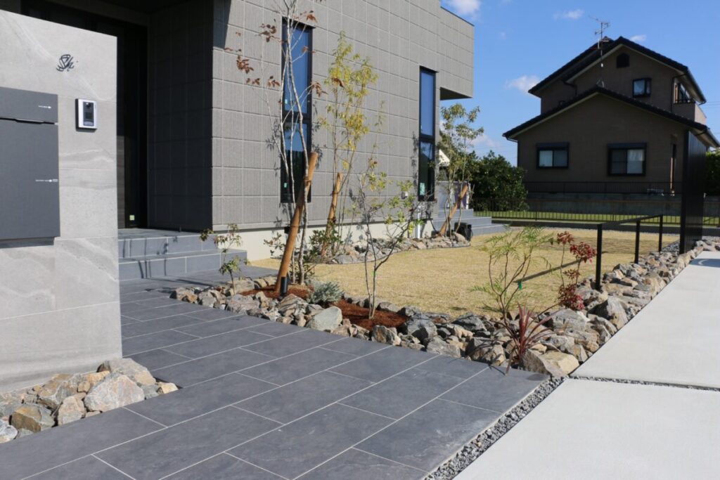 玄関ポーチからアプローチ・門柱と重厚感のあるタイル貼りと手摺りと角柱の仕切りが織りなす植栽部のオープン的なデザインが気持ち良い空間