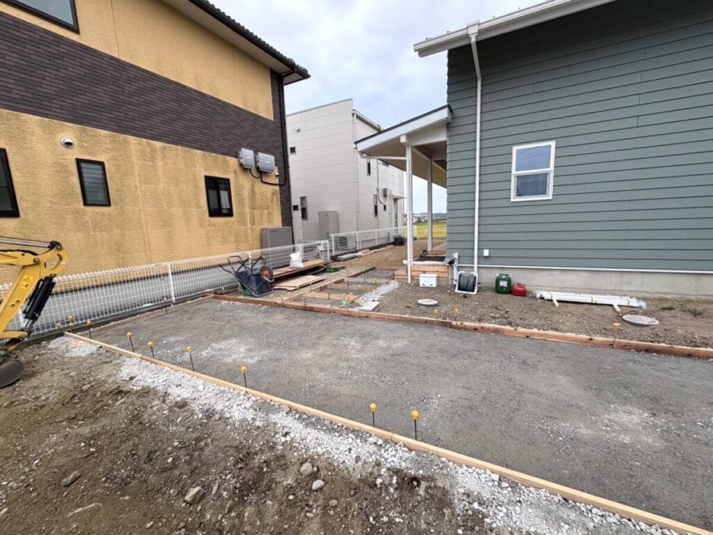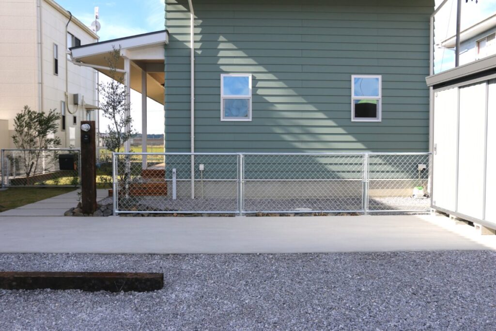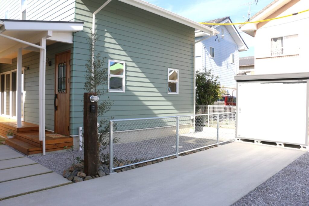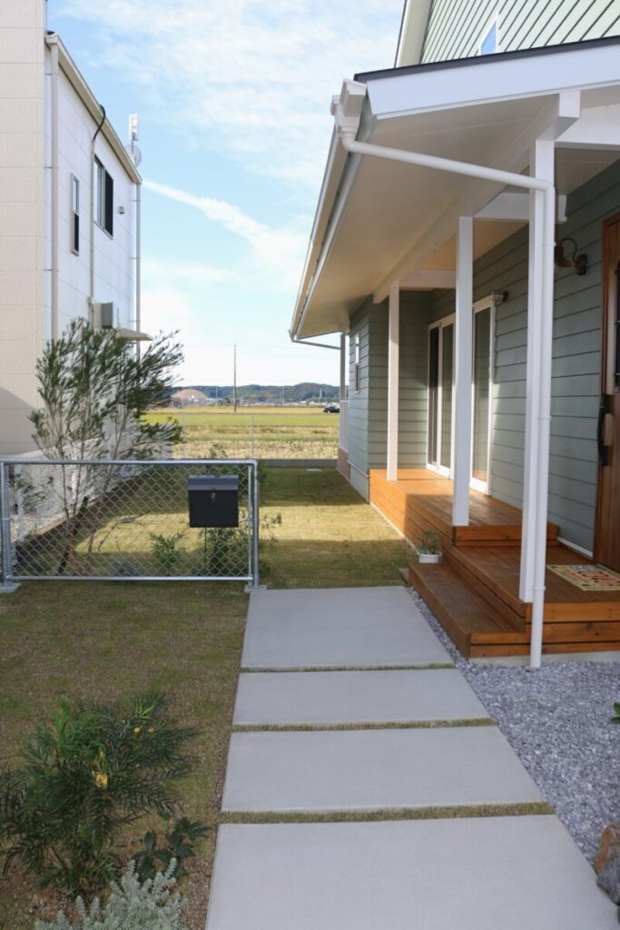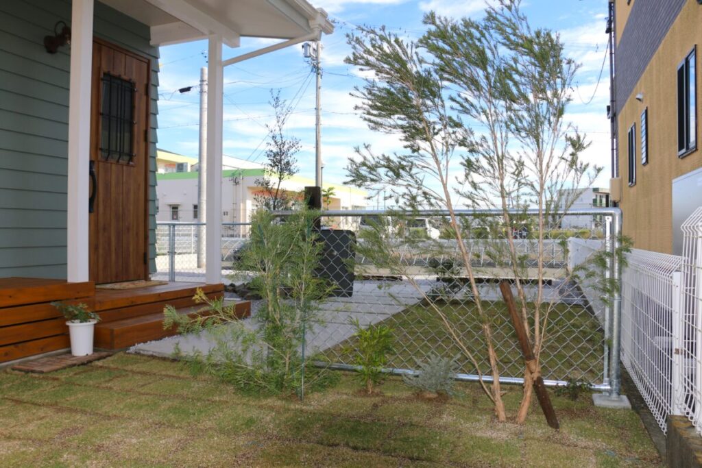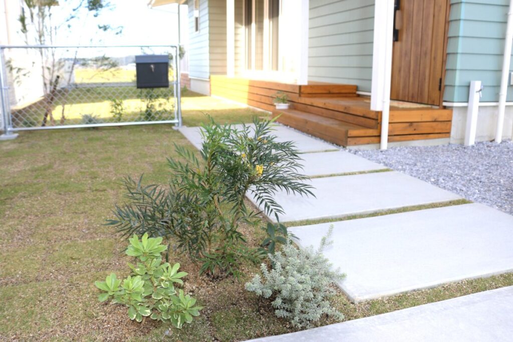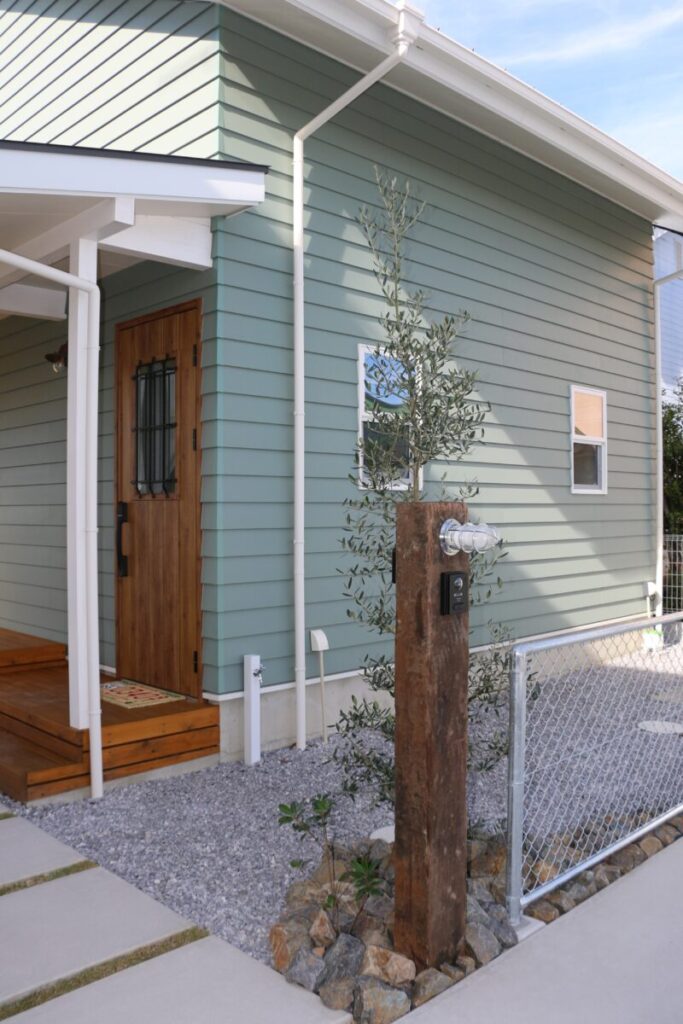 PCフェンス・メッシュフェンスにポストがぶら下がる様に取付され古木門柱とそれぞれがかわいらしく存在感を出しています。砕石は白砕石を使用しコンクリート刷毛引き仕上げと色合いを合わせました。マフォニア・ウエストリンギア・オリーブ・ティーツリーと異国の植物が植えられているこのお庭と淡いエメラルドグリーンのお家はまるで海外移住しているようなドキドキ・ワクワクの気持にさせてくれます。