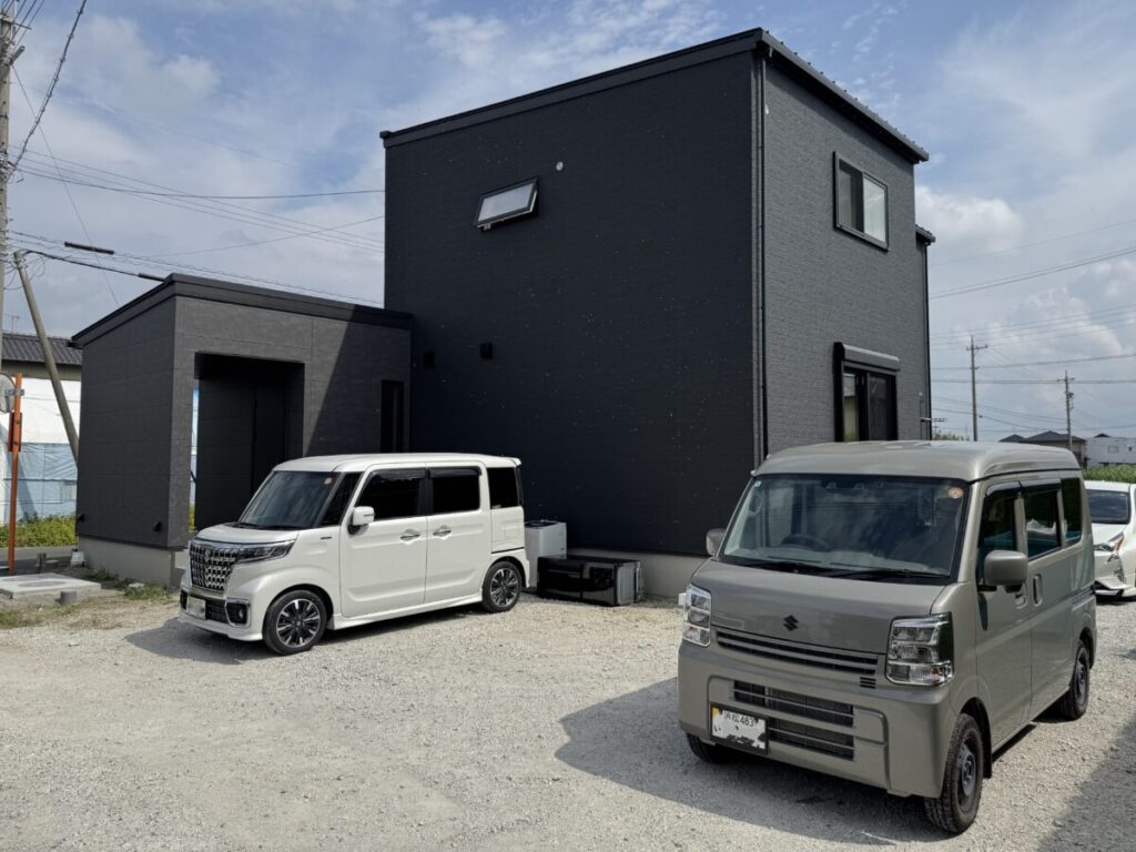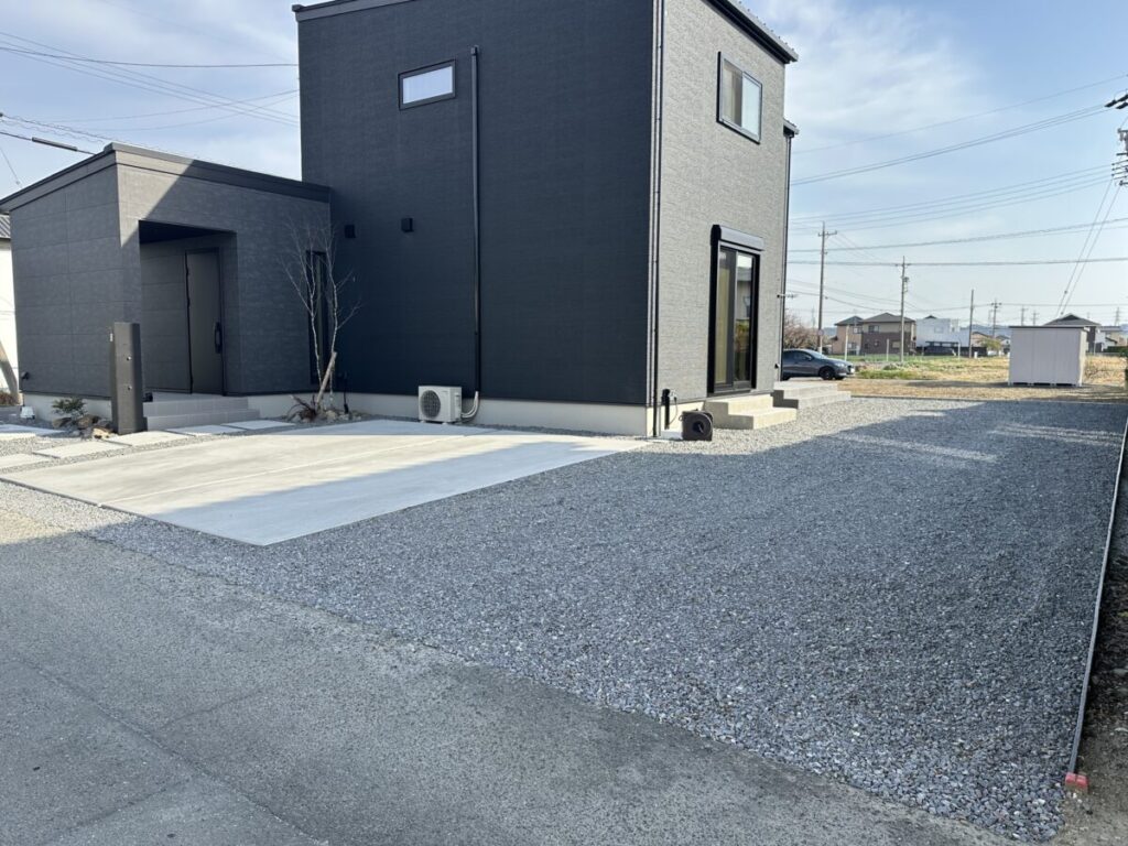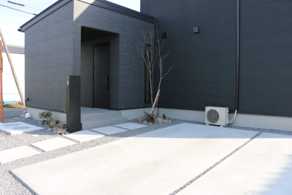 玄関アプローチ周りは華やかにし毎日使う駐車場は2台分コンクリート敷きで確保しリビング前はタイルデッキにしました