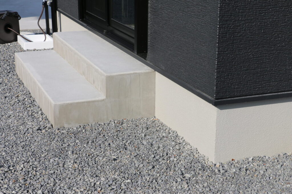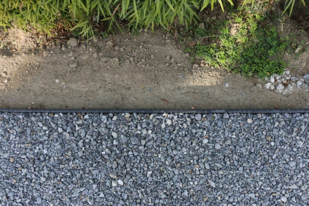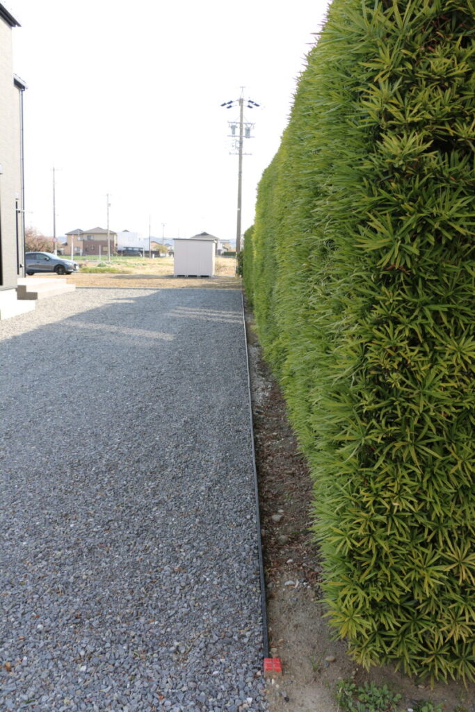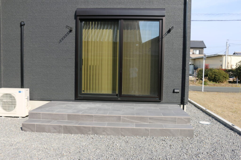 樹脂デッキは樹脂デッキの良さがありますが、タイルデッキは長期的に変色変形が少なくお手入れが断然楽な感じがします。隣地との境界は最低限のブロック積みとエッチング材で区切りました。今後ご家庭の生活様式に合わせて砂利を芝生にしたりフェンスを付けたりと変更も容易な外構になりました。