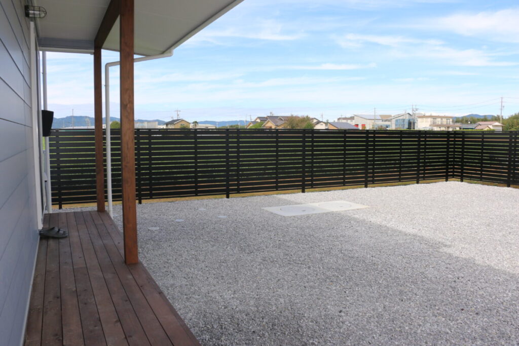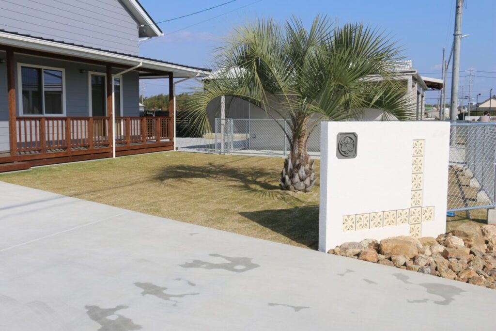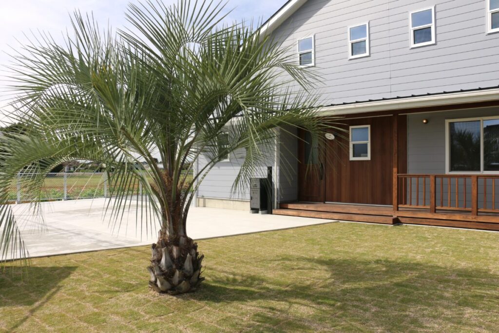 広い空の下にすっと伸びるヤシの木と、ゆったりとした芝生のスペース。 まるでアメリカ西海岸の住宅街にいるような、ラフで心地よい開放感が広がるお庭です。 白いウォール門柱が個性的でアクセントになっています。シンプルな外観にちょうどいい抜け感をプラス。 家の前を通る風がそのまま庭へ流れ込むような、軽やかなデザインに仕上げました。 アメリカンフェンス(PCフェンス)の抜け感も相まって、視線を遮りすぎず、ほどよい“オープンさ”をキープ。 日常の中にリゾートのようなゆとりが生まれ、家全体が明るくのびやかに見える外構です。