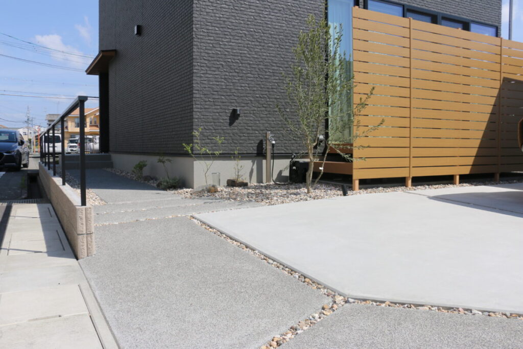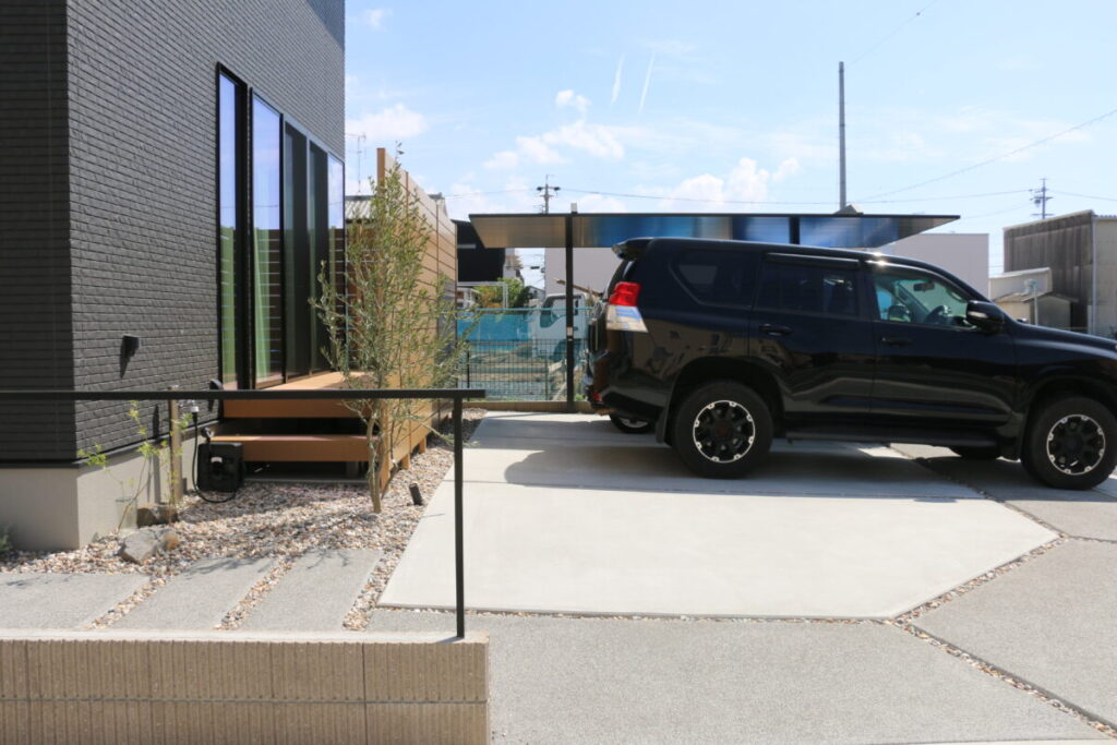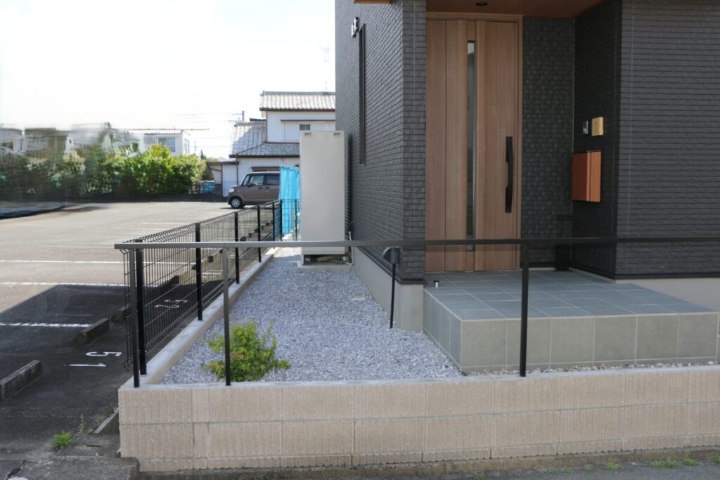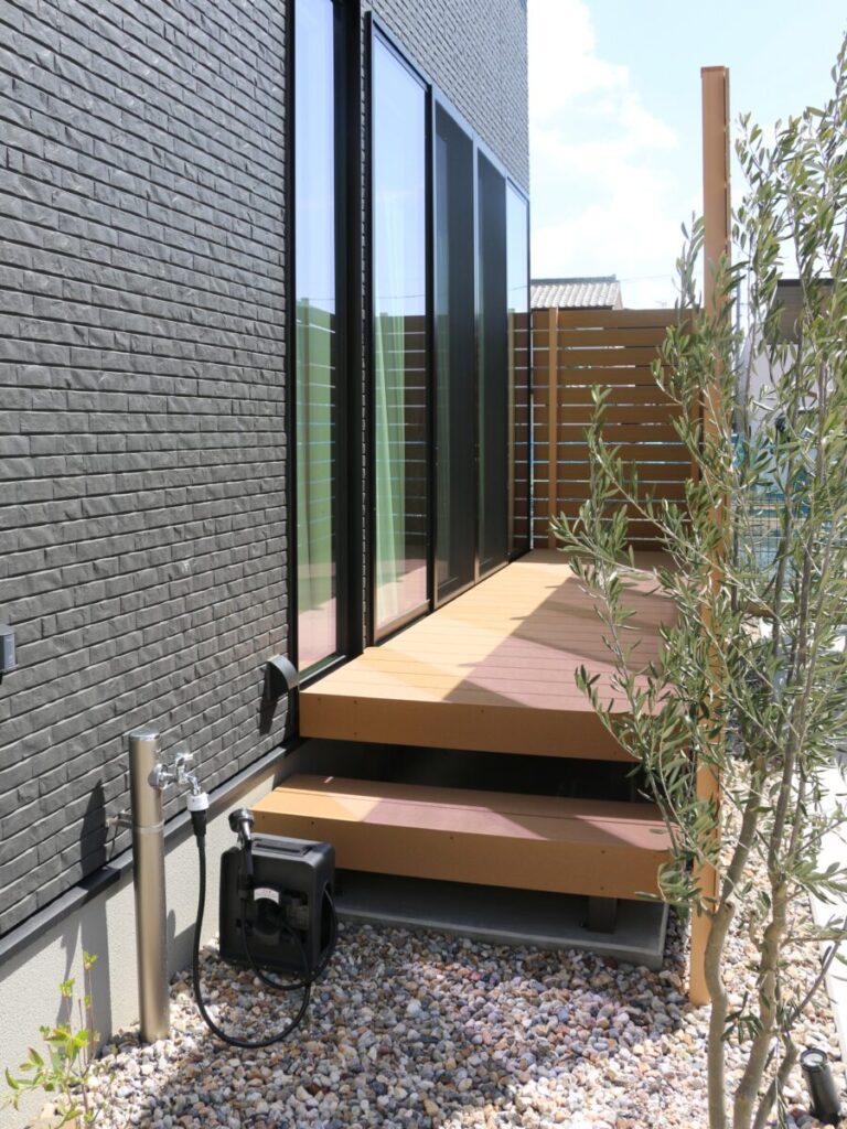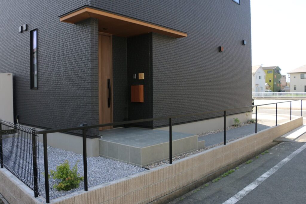 直線的で引き締まった外観に、木の質感がそっと寄り添う外構デザイン。 無機質になりすぎず、ほどよい温度を感じられるお庭です。 足元の洗い出し仕上げや砂利も余白を大切にしたジャパンディらしい佇まいに。 植栽の影が壁に落ちるだけで、空間にやわらかな表情が生まれます。 木製フェンスやデッキの色味は、建物のダークトーンと美しく調和し、 “かっこいい”だけで終わらない、どこか安心できる雰囲気をつくり出しています。 そんなジャパンディスタイルの外構です。