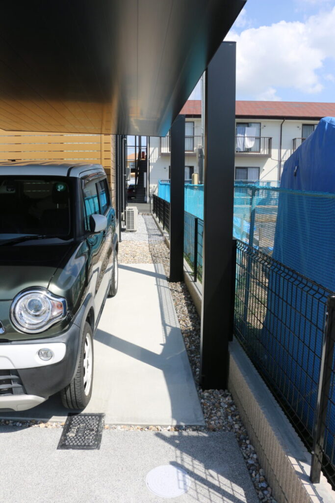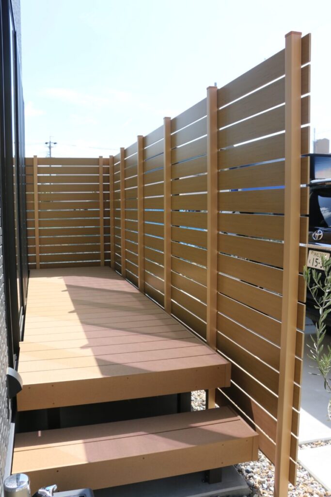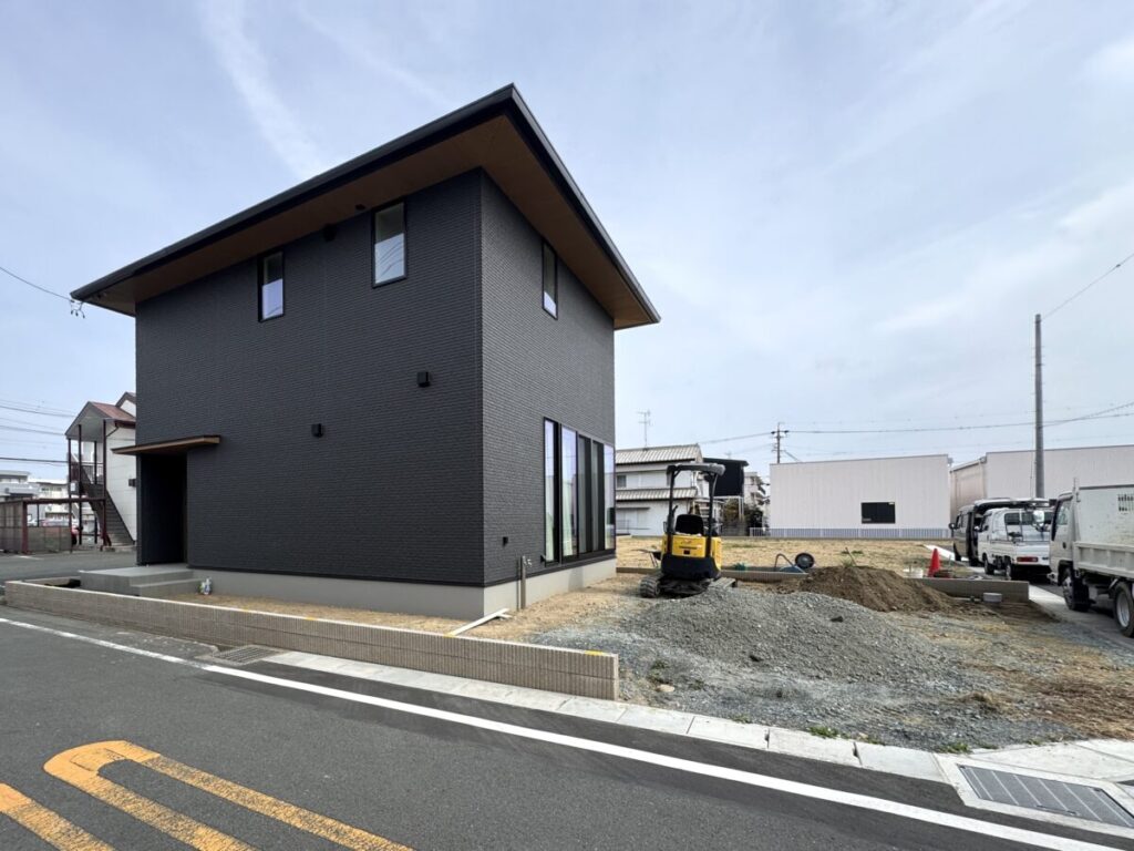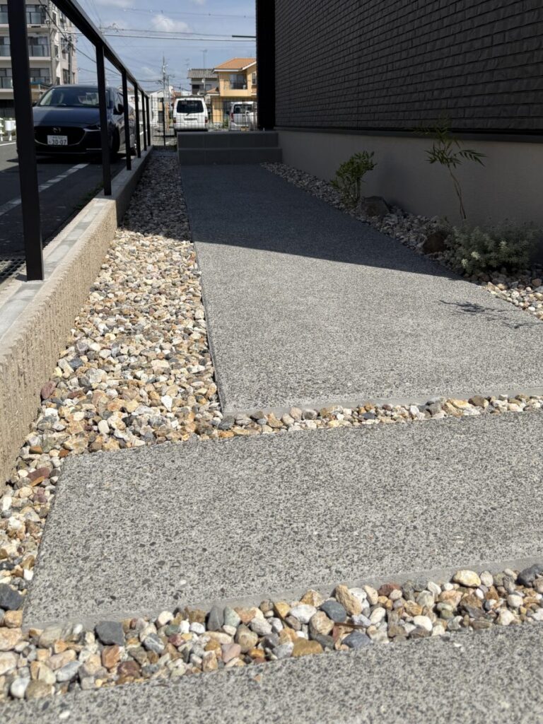 直線的で引き締まった外観に、木の質感がそっと寄り添う外構デザイン。 無機質になりすぎず、ほどよい温度を感じられるお庭です。 足元の洗い出し仕上げや砂利も余白を大切にしたジャパンディらしい佇まいに。 植栽の影が壁に落ちるだけで、空間にやわらかな表情が生まれます。 木製フェンスやデッキの色味は、建物のダークトーンと美しく調和し、 “かっこいい”だけで終わらない、どこか安心できる雰囲気をつくり出しています。 そんなジャパンディスタイルの外構です。